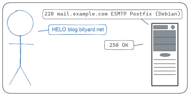 When you connect to an SMTP server, it will tell you its name and then wait for you to greet it with yours. The first thing you say to a mail server is almost literally, "Hello, I am (insert name here)." You greet the server and tell it the hostname of the machine you're sending mail from.1 If you didn't offend it somehow, the mail server responds simply with 250 OK. In the following example, I have connected to the mail server at mail.example.com and told it that my own hostname is blog.bityard.net: