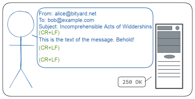 This means the server is ready to accept the message. Each mail message consists of two parts, the headers and the body. These must be separated by a blank line. (If you're reading this article, I'll presume you know what email headers are.) Note that the mail server is helpfully telling you how to signal the end of the message: A blank line, a dot, and another blank line. Here's an example of what to send:
